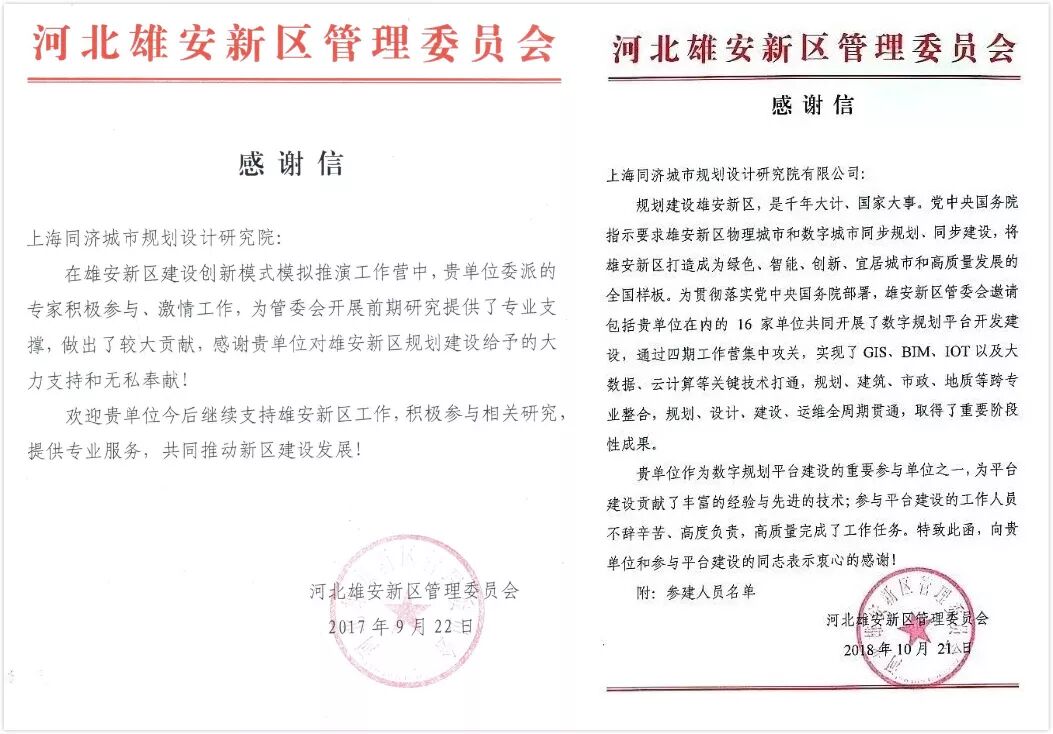2019年1月25日,中共河北雄安新区工作委员会、河北雄安新区管理委员会给学校发来一封感谢信。信中提到,上海同济城市规划设计研究院有限公司作为国内规划设计领域的一流规划设计单位,以较高的政治站位和使命责任感,选派了张浩和吴冠同志来新区规划研究中心工作,给予雄安新区规划任务大力支持。这是雄安方面第三次给学校发来感谢信。早在2017年9月,河北雄安新区管理委员会给学校来信,表彰上海同济城市规划设计研究院在雄安新区建设创新模式模拟演练工作营提供的专业支撑;2018年10月,河北雄安新区管理委员会再次来函,感谢上海同济城市规划设计研究院作为数字规划平台建设的重要参与单位之一,在雄安新区物理城市和数字城市同步规划、同步建设工作中,提供了丰富的经验与先进的技术,为将雄安新区打造成为绿色、智能、创新、宜居城市和高质量发展的全国样板作出贡献。